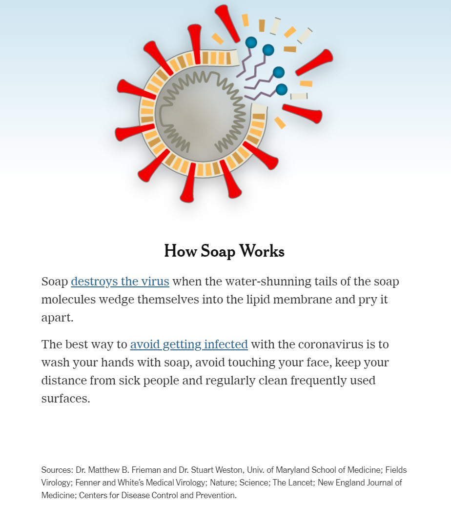 The virus ss-RNA is surrounded by a "greasy" lipid (oily) envelope. Soap dissolves the envelope.