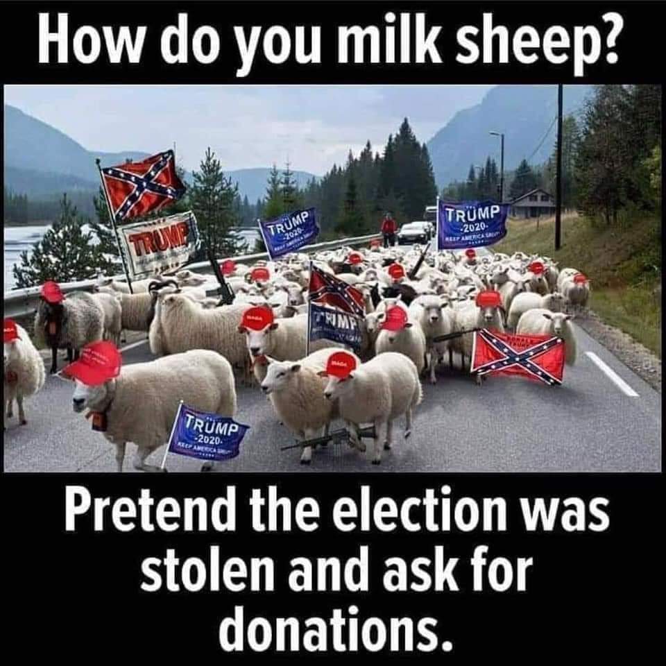 Orange face, tiny hands Shepard milking the mindless little MAGA sheep...lol
