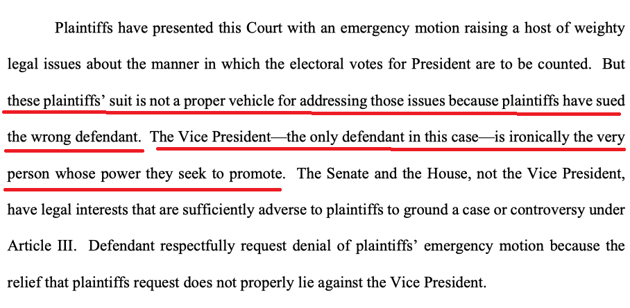 the Electoral Count act contradicts itself. thus, the proper thing would be for pence to refer to the constitution, as federal law cannot override the constitution. the constitution lays out that only PENCE has the right to count the votes. Which was the purpose of the lawsuit. To declare the ECA unconstitutional, which it is. Hence the contradiction comment cuz the suit was basically asking the judge to recite the 12th Amendment. Pence can throw all 7 disputed states electors and no one can do a damn thing