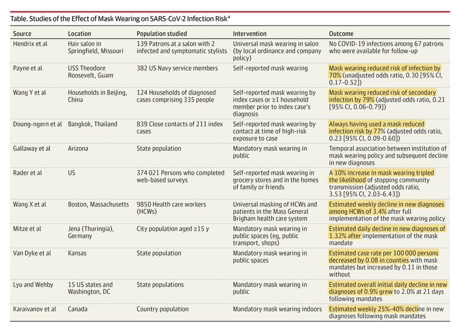 Attached you will find the latest papers showing efficacy of mask wearing for COVID-19. These are not RCT’s admittedly. The one RCT was the Danish mask study which showed a small positive effect of protection for the wearer. That study though was underpowered. People in the controls could wear a mask if they wanted, and compliance wasn’t strict for the mask wearing group.