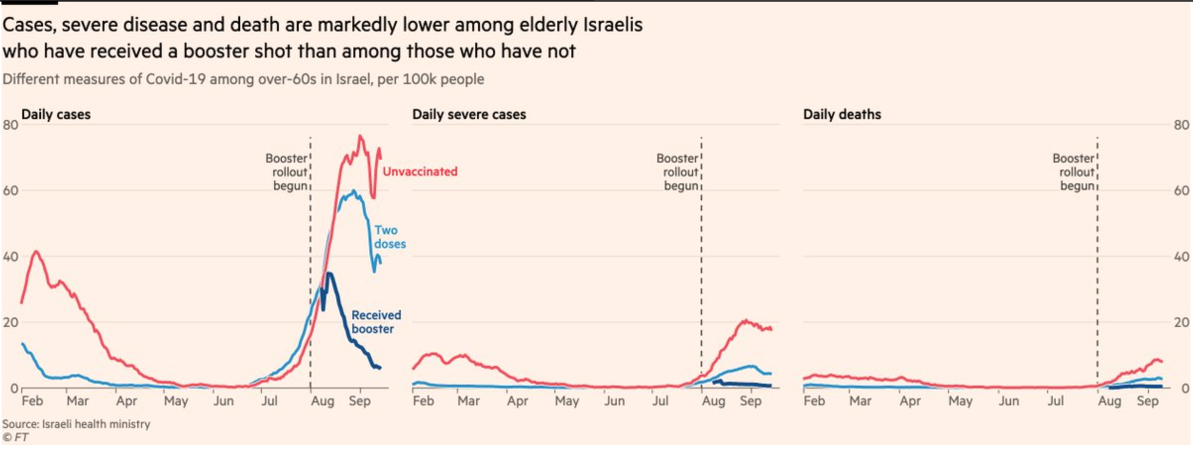 Waterdisport22 wants you to compare absolute risks from two different time points. This is a no-no for two reasons. First, the whole point of the experiment is to control for other variables. Comparing at two different time points goes against this. In other words, because of other factors, you can't really compare. There are different variants, different seasons, different positivity rates... Secondly, comparing by absolute risks doesn't make sense because then you are dependent on the length of the study. An absolute risk will be different for 2 days, 5 days, or 10 weeks. To become independent of time of the study, you need to use the relative risk, which is very high for the booster -- 96%.