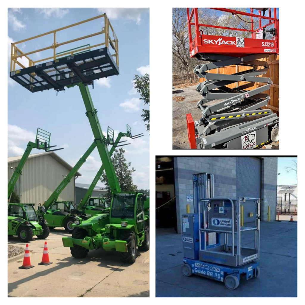 You need either a bucket truck or manlift, a scissor lift won't work as they are only straight up and down. Might consider a tree trimmer to prune it