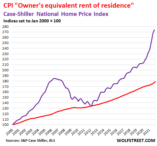 The actual costs of buying a home spiked in 2021 by around 20%, according to the Case-Shiller Home Price Index, depicted in my series, The Most Splendid Housing Bubbles in America. This price spike leaves in the dust the Owner's equivalent of rent, the stand-in for the costs of homeownership. Both, the Case-Shiller index (purple) and the Owner's equivalent of rent (red) are set to 100 for January 2000."