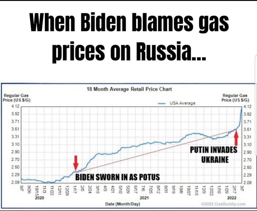 Biden comes in and puts a halt on new leases and shuts down Keystone and fuel prices soar, and he's the one sucking Putins dick for more oil imports....