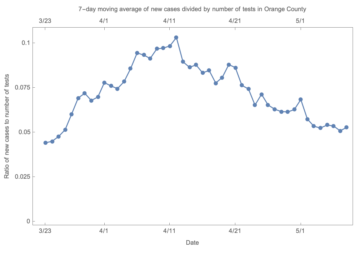 OC has been moving the testing data around, so I updated the chart. Unlike LA county, you need to have symptoms to get a COVID-19 test in OC. So, the decrease observed is not due to an influx of asymptomatic people that likely would bring the positivity ratio (of cases to tests) down.