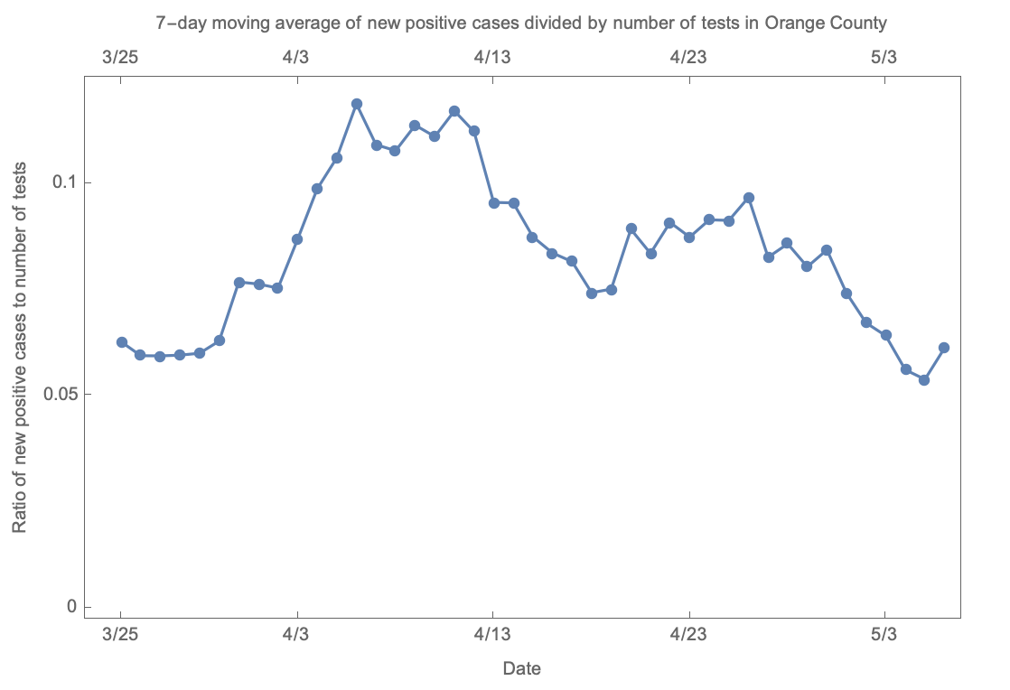 I decided to examine this ratio using data from Orange County. Our positive cases divided by tests peaked in early to mid April, but now is steadily going down. (See attached plot). This trend was confirmed by IHME's own model for number of cases for the entire state of California. (See link #2).
