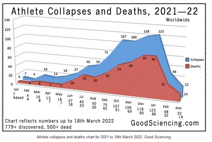 The mainstream media still are not reporting most, but sports news cannot ignore the fact that soccer players and other stars collapse in the middle of a game due to a sudden cardiac arrest. Many of those die more than 50%.