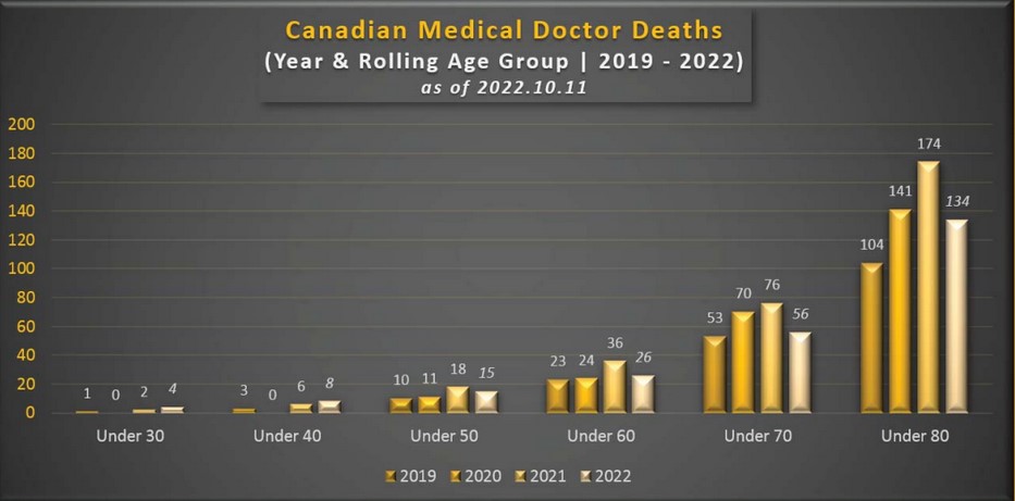 My team has assembled a database of 1638 Canadian doctor deaths during the period 2019 2022, with 972 of them from CMAs own website. Our preliminary analysis of this extensive data suggests that Canadian doctor deaths under age 50 in 2022 will be 2 fold higher compared to the 2019 2020 average. Shockingly, Canadian doctor deaths under age 40 are already 5 fold higher in 2022 compared to the 2019 2020 average, and Canadian doctor deaths under age 30 are 8 fold higher!